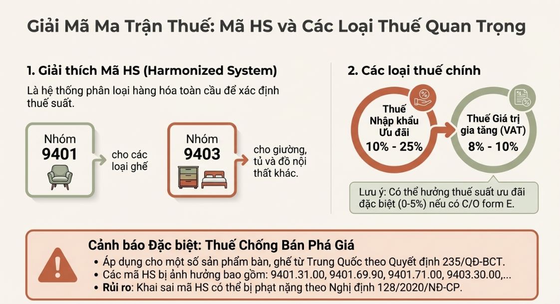Thông tin quan trọng về Thuế Chống Bán Phá Giá (ACD): Đây là điểm người mới dễ nhầm lẫn nhất. Theo Quyết định số 235/QĐ-BCT, một số mặt hàng bàn, ghế bằng gỗ hoặc kim loại từ Trung Quốc bị áp thuế chống bán phá giá nếu trùng với các mã HS cụ thể (như 9401.31.00, 9403.30.00...).